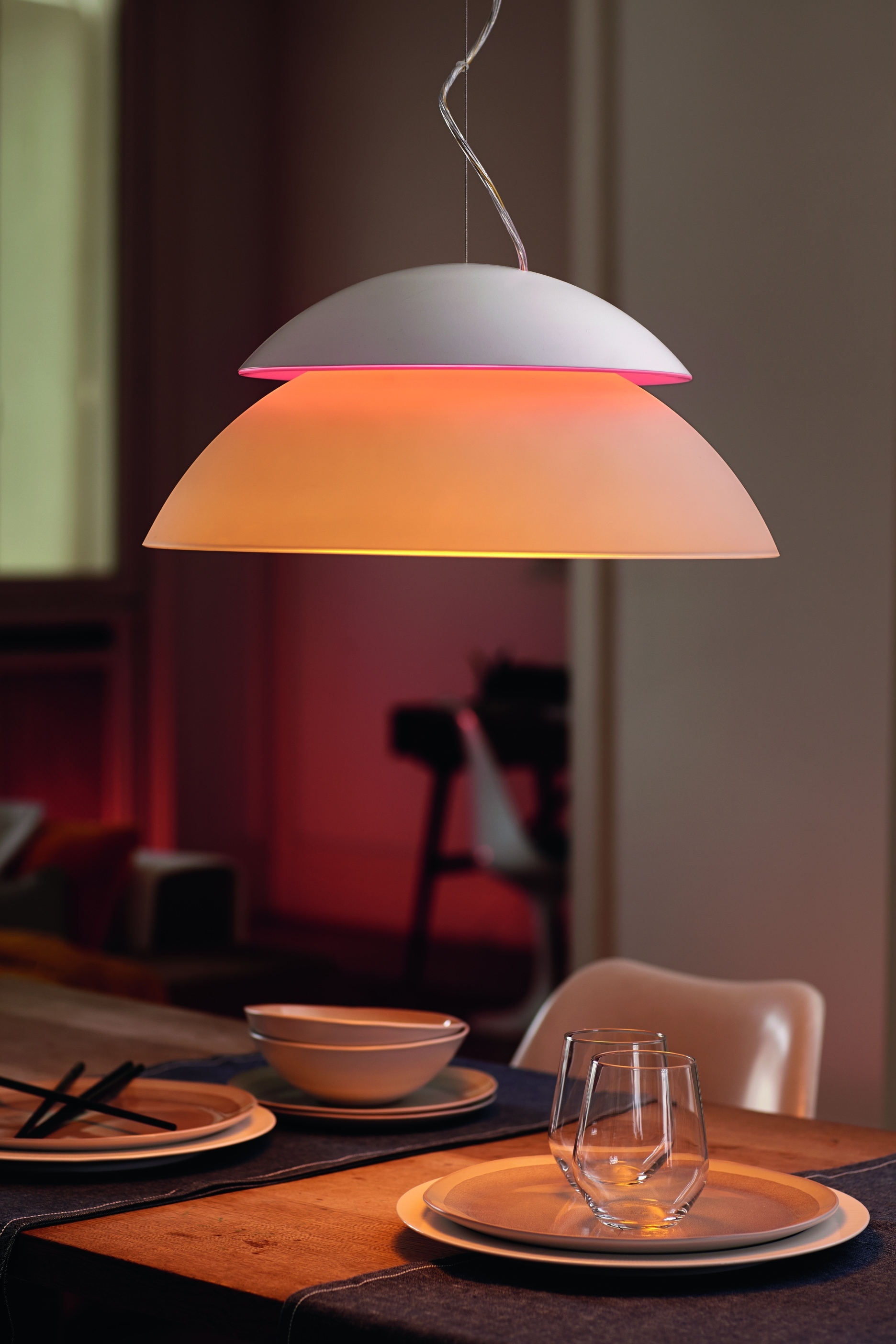 Hue Beyond-Leuchten verfügen über zwei LED-Module, deren Licht zum einen nach oben, zum anderen nach unten gerichtet ist. Beide Lichtquellen lassen sich per hue-App unabhängig voneinander steuern. Das ermöglicht zahlreiche neue Lichtszenarien, um die Wohnraumbeleuchtung noch variabler und attraktiver zu gestalten. Beispielsweise ein entspannendes Abend-Ambiente aus warmen Farbtönen bei zugleich perfektem Weißlicht zum Lesen. Die elegante Tischleuchte ist ideal für zum Beispiel häusliche Arbeitszimmer. Die Pendelleuchte passt ausgezeichnet über Esstische, und die Deckenleuchte ist perfekt für Wohnzimmer geeignet, in denen sie sich multifunktional einsetzen lässt.