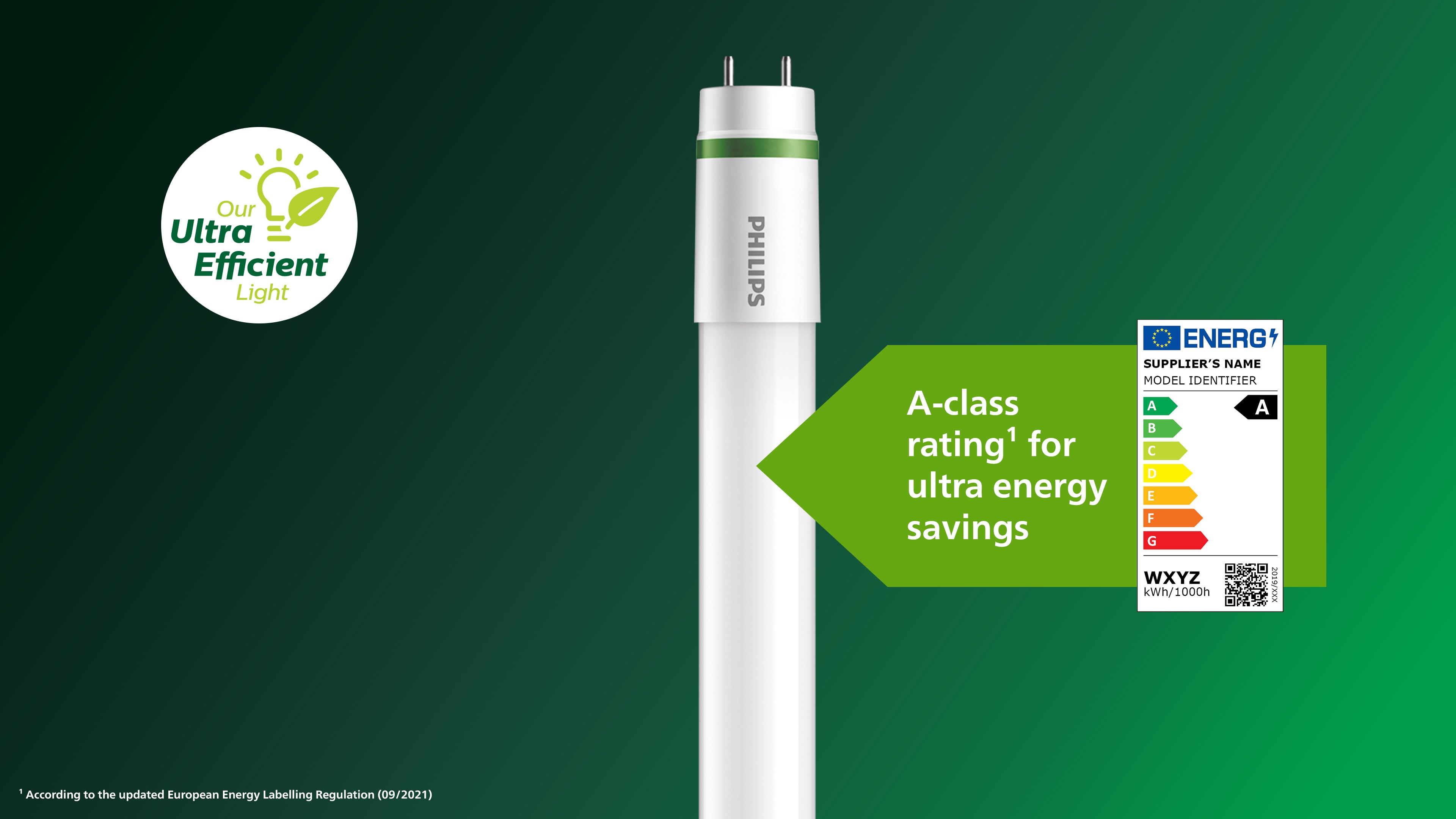 Signify hat bereits im vergangenen Jahr mit der Markteinführung der ersten Philips LED-Lampe der Energieeffizienzklasse A einen großen Schritt in Richtung Nachhaltigkeit gemacht. Die Lampe verbraucht rund 60 Prozent weniger Energie als eine herkömmliche LED von Philips. Die neue MASTER LEDtube UE setzt diesen Ansatz fort, indem sie das Portfolio an Produkten erweitert, die den Anforderungen der höchsten Energieeffizienzklasse entsprechen. Nach den neuen Maßstäben der EU-Verordnung müssen Beleuchtungsprodukte eine Energieeffizienz von mindestens 210 lm/W aufweisen, um die höchste Energieeffizienzklasse A zu erreichen.