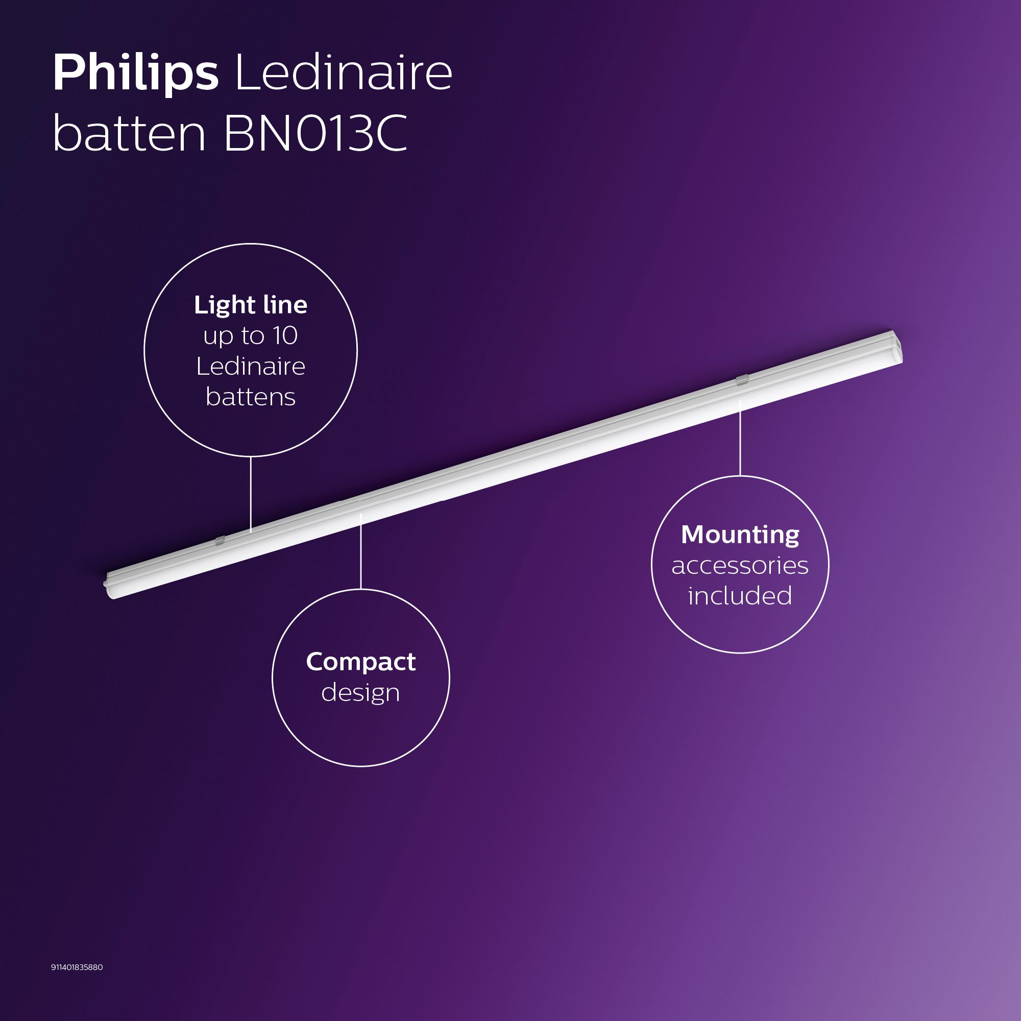 The Ledinaire batten (BN021C) range contains a selection of popular off-the-shelf batten LED luminaires that comes with the high Philips quality levels at a competitive price. Reliable, energy efficient and affordable. Ledinaire enables, simple and flexible installation, with light-line creation possibility.