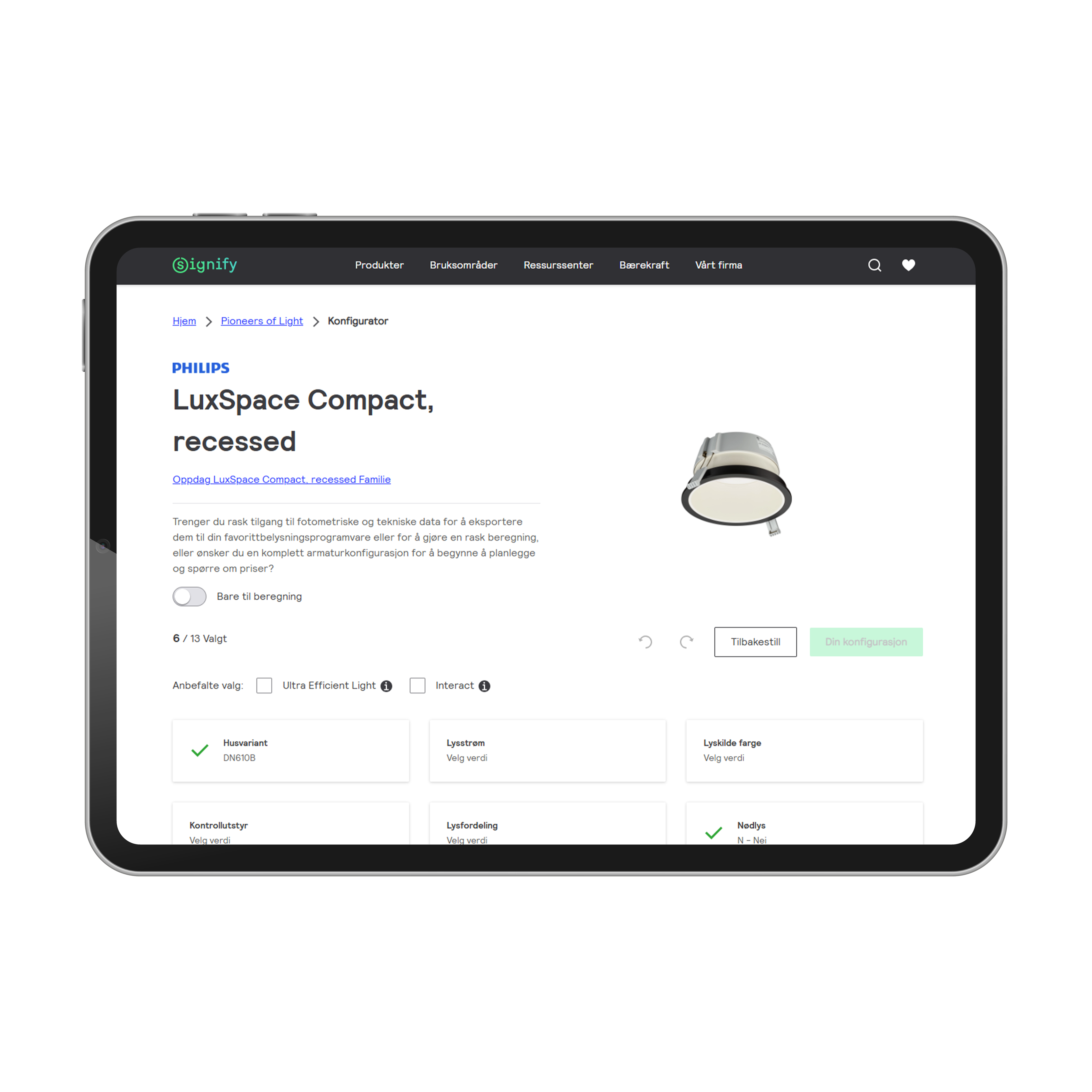 Her kan du enkelt konfigurere en armatur til prosjektet ditt.