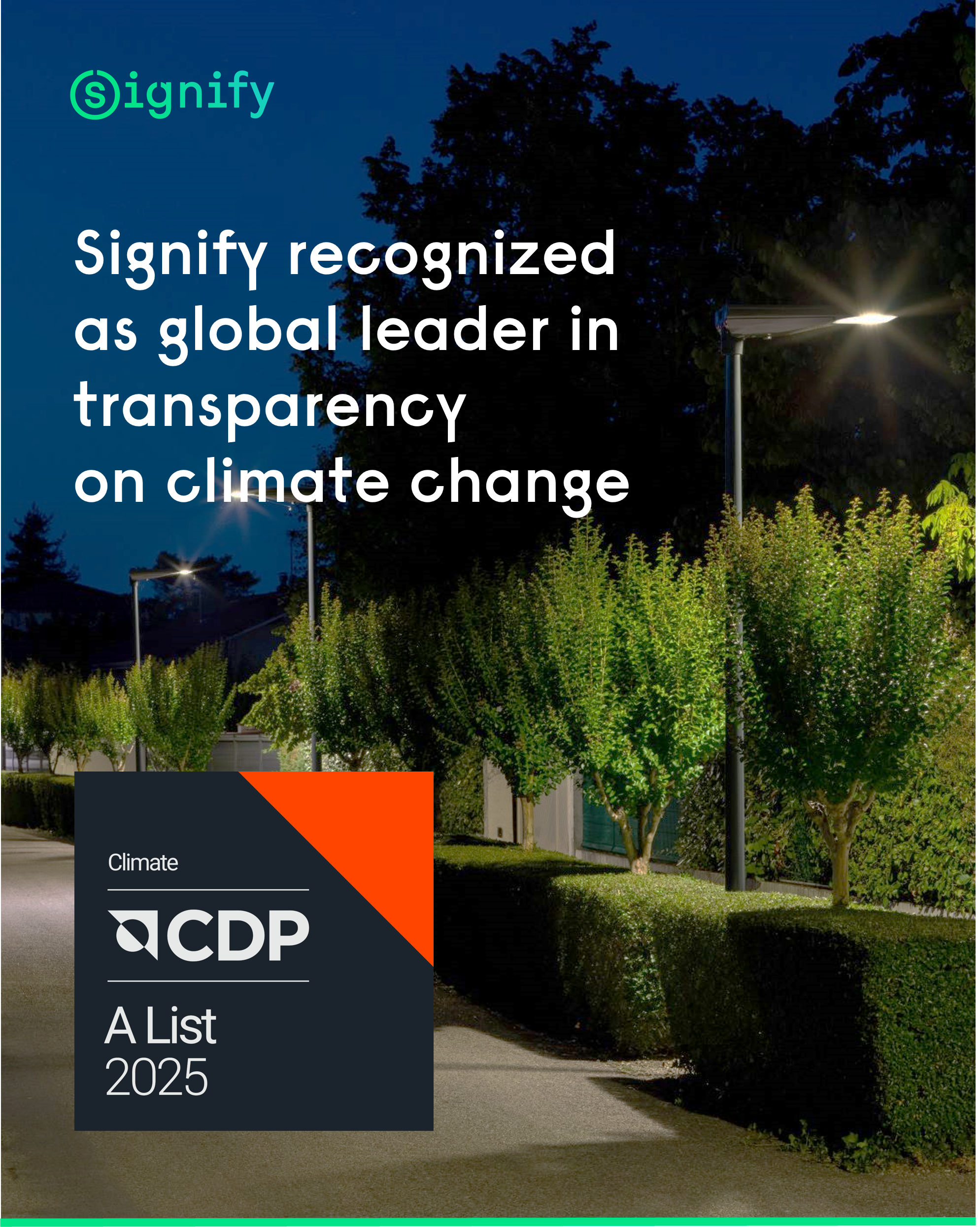 CDP to globalna organizacja non-profit, która ocenia firmy pod kątem jakości i szczegółowości ujawnianych informacji środowiskowych. W 2025 roku przeanalizowano ponad 20 000 przedsiębiorstw. Ocena „A” przyznana Signify jest wyrazem uznania dla jej transparentnego raportowania, wnikliwej analizy ryzyk środowiskowych oraz wdrażania najlepszych praktyk, w tym ambitnych celów redukcji emisji.